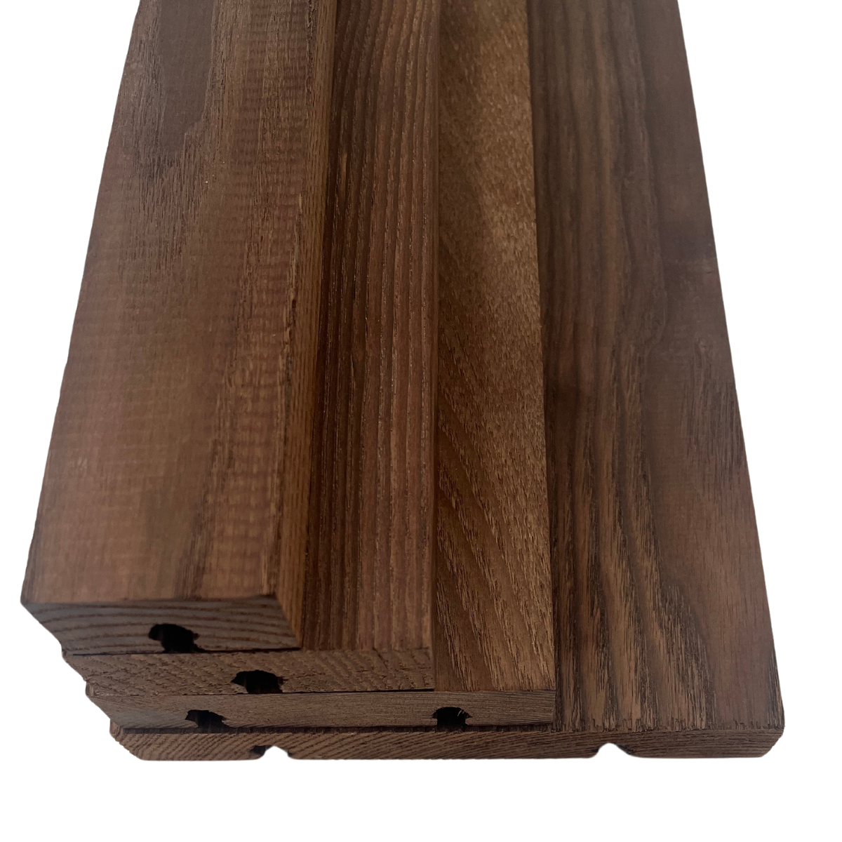 Thermo essen is essenhout uit Europa dat thermisch wordt gemodificeerd zonder chemische toevoegingen. Door het hout te verhitten tot ca. 215 °C met stoom, verandert de celstructuur, wat zorgt voor een verhoogde duurzaamheid en vormvastheid. Hierdoor is het hout vergelijkbaar met tropisch hardhout, maar aanzienlijk milieuvriendelijker. Het is een ideale keuze voor wie zoekt naar esthetiek, prestaties én ecologische verantwoordelijkheid.
