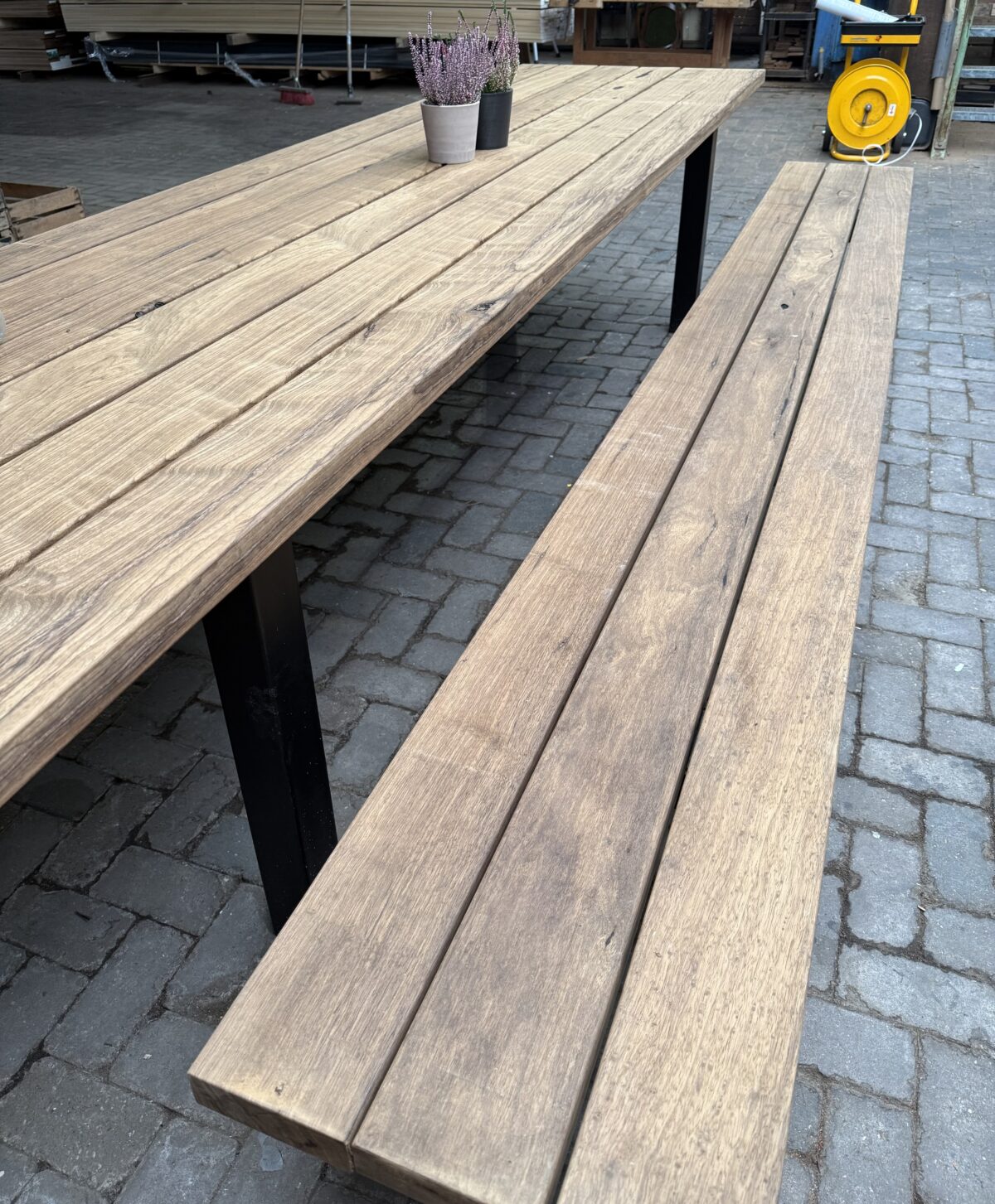 Jij bepaalt de lengte en kiest uit verschillende houtsoorten, zodat de buitenset naadloos aansluit bij jouw omgeving. Of je nu houdt van warme, natuurlijke houttinten of een strakke, moderne look – wij maken jouw maatwerk buitenset tot in perfectie. De tafels zijn ook zonder banken of met één bank te bestellen neem hiervoor contact op. De onderstaande prijzen zijn inclusief twee banken.