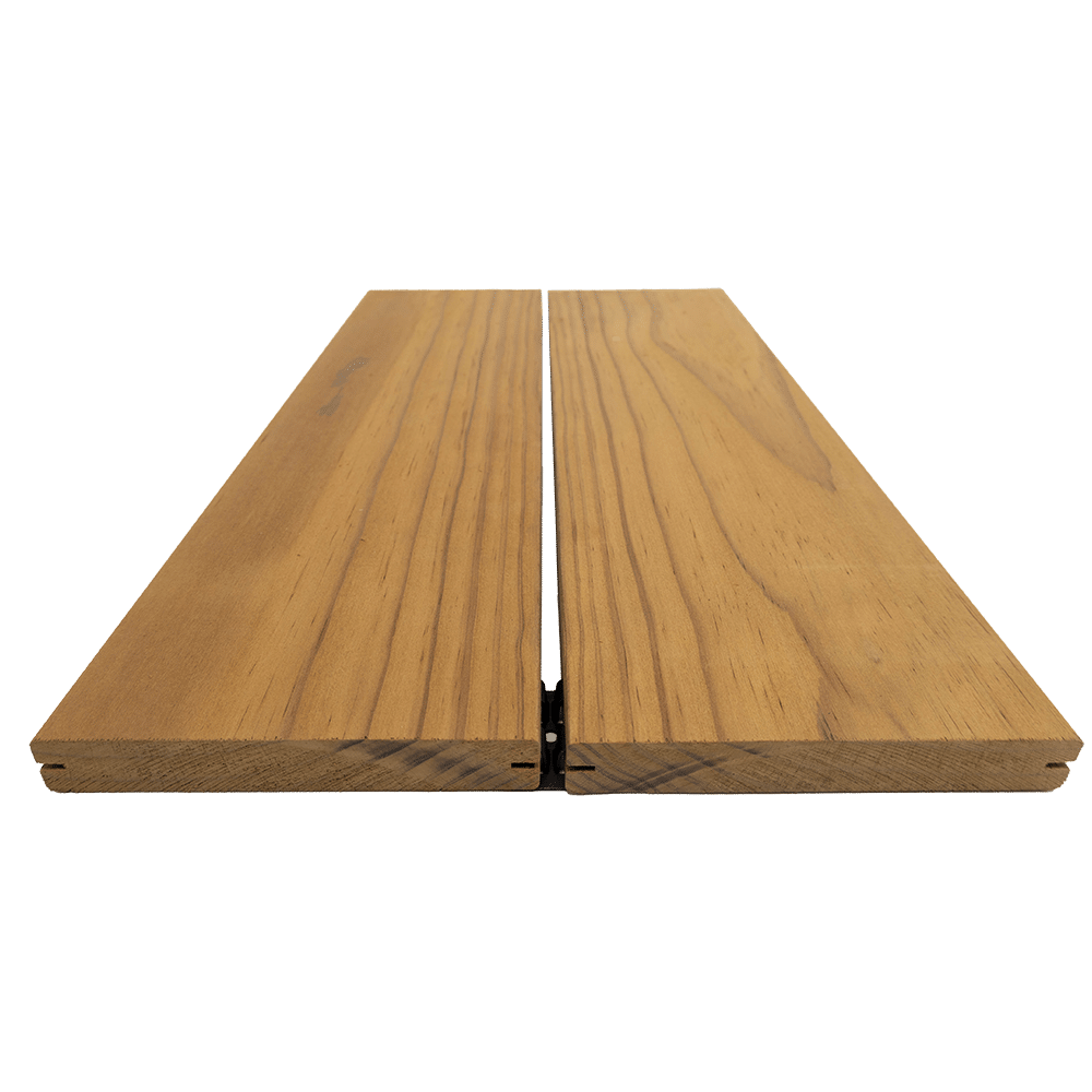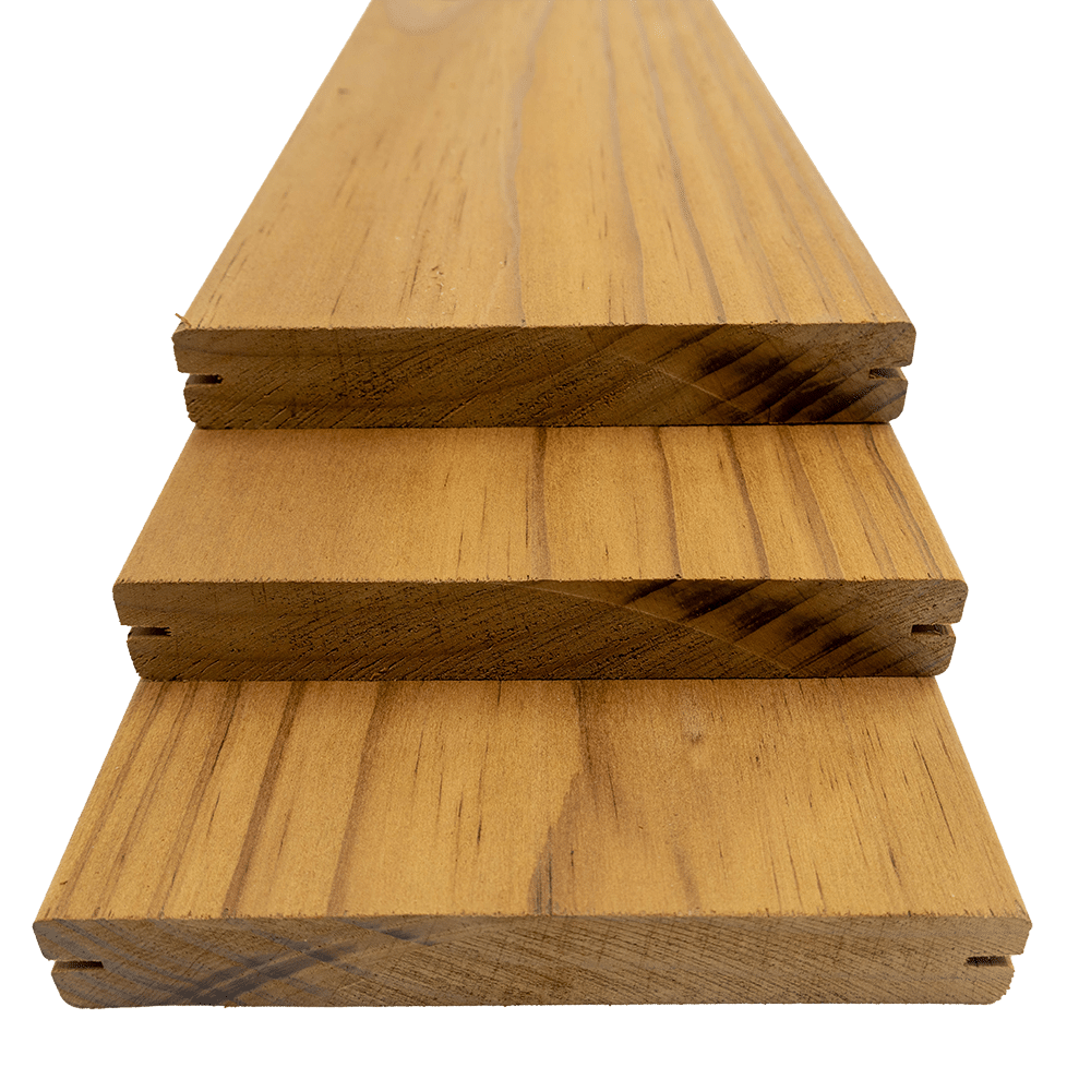 Het uiterlijk van Thermo Radiata Pine in VClip is warm, karamelkleurig met een fijne nerf en een geborsteld oppervlak.