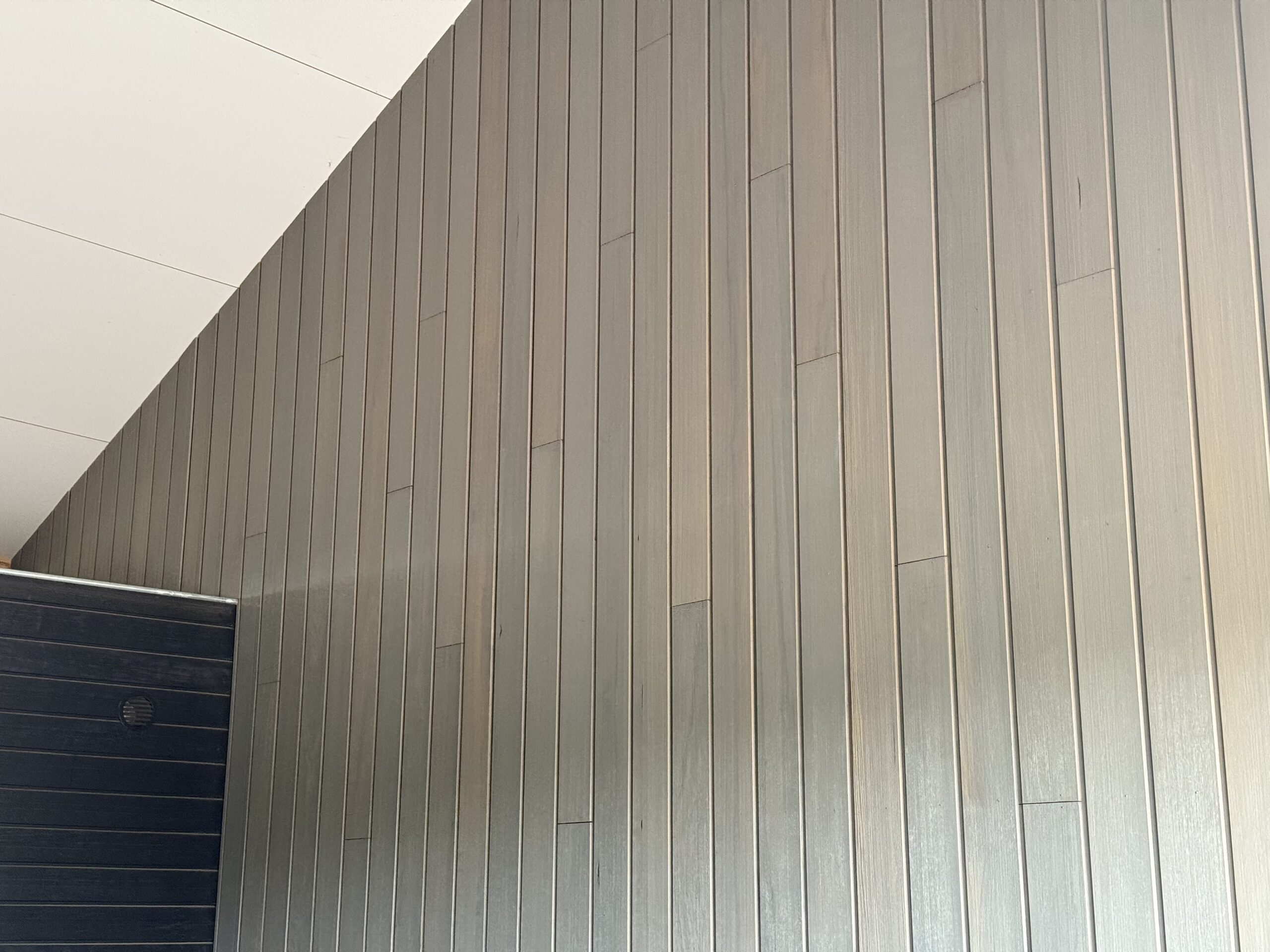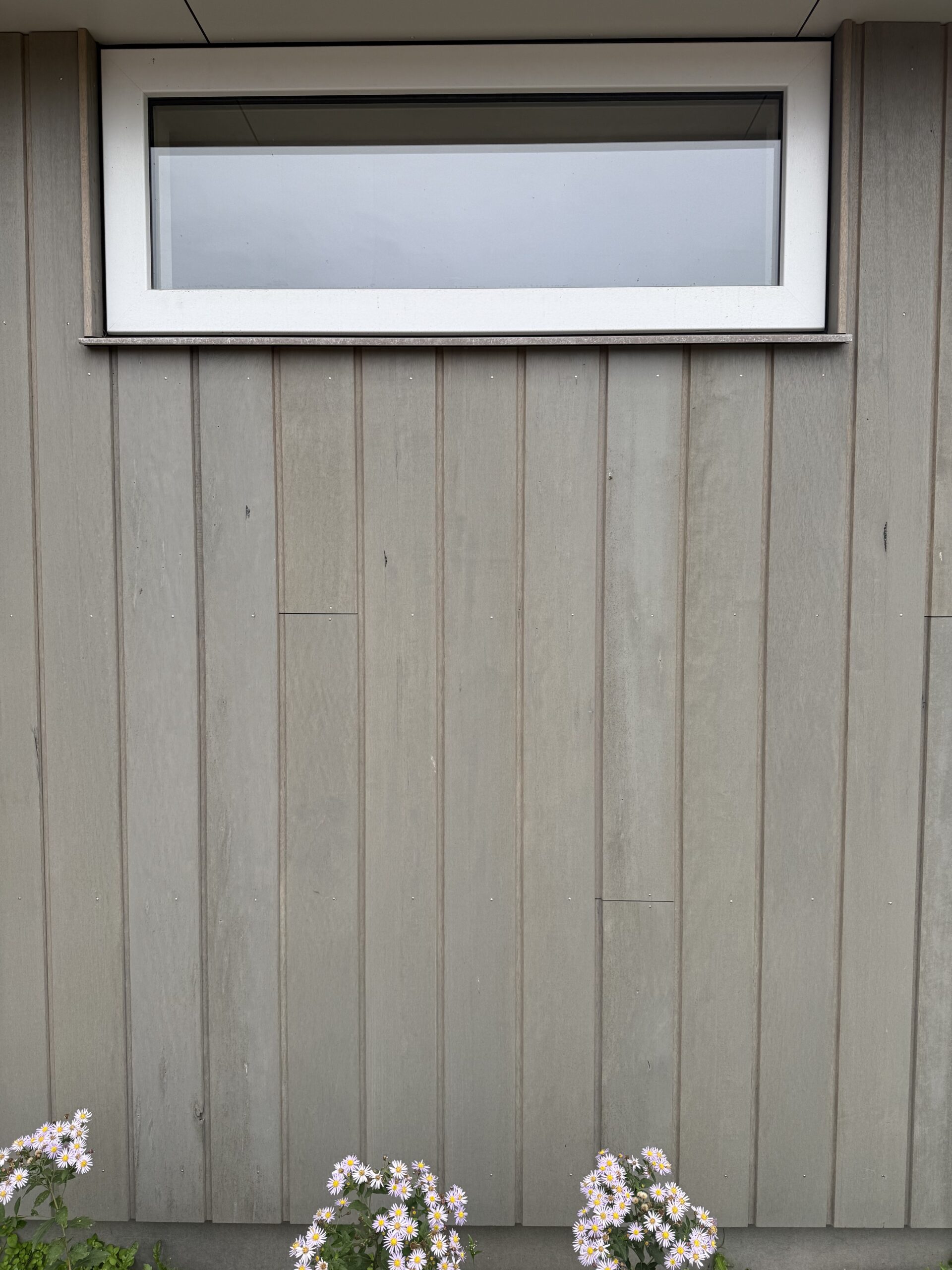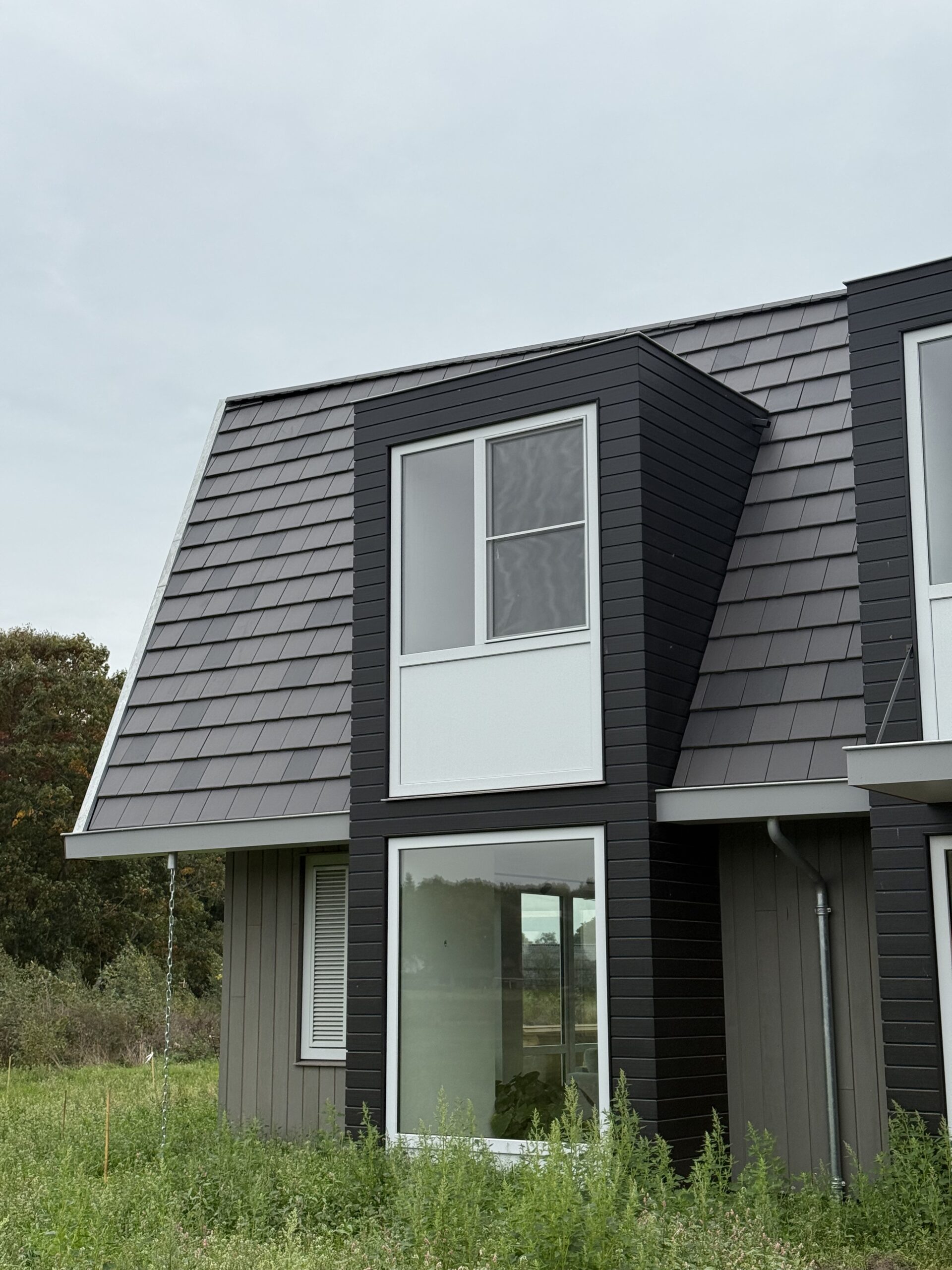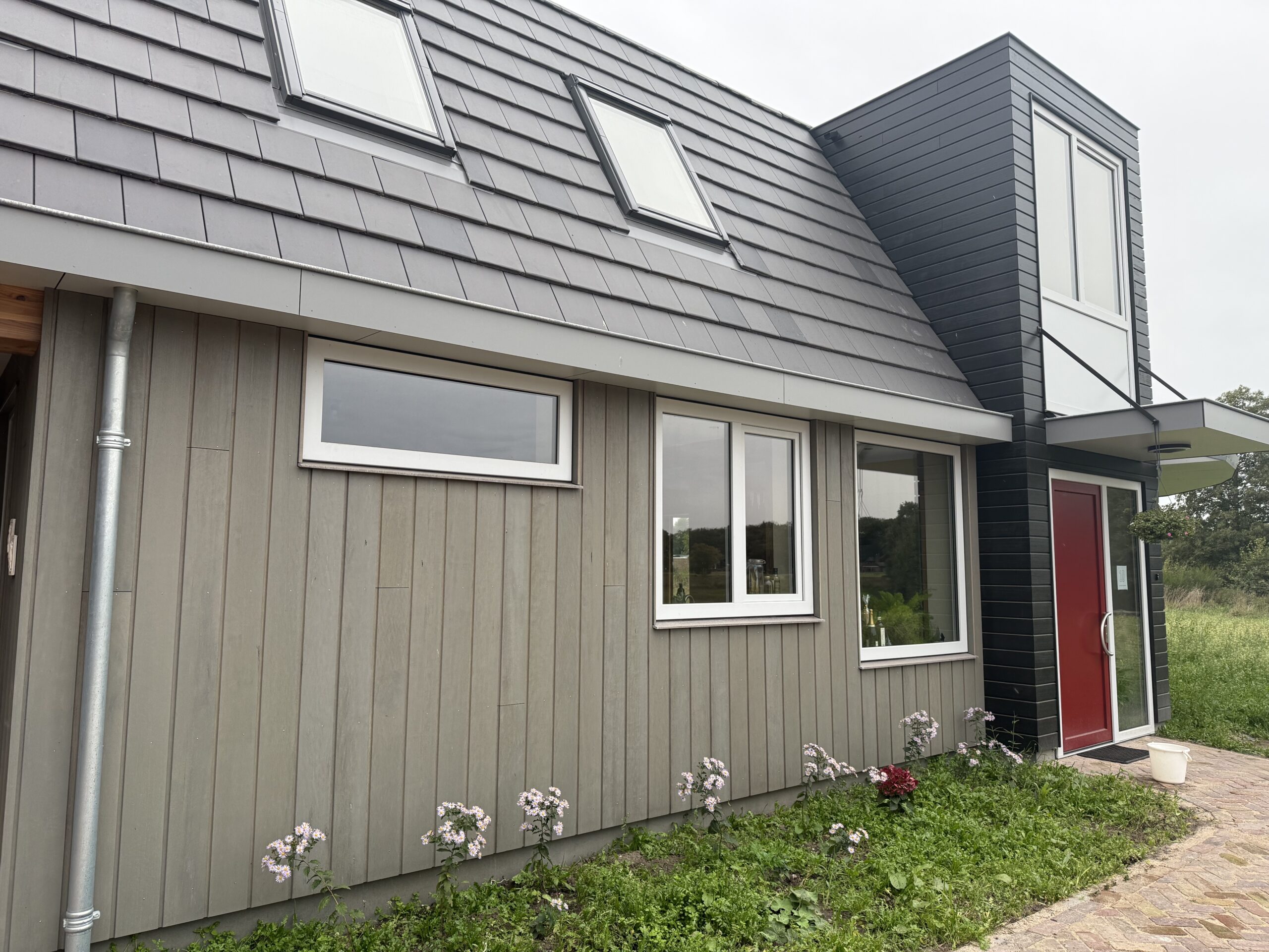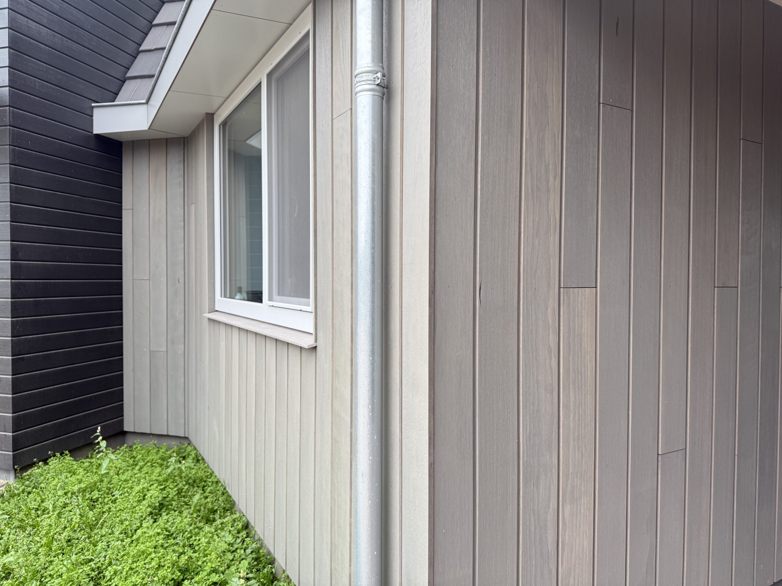 Voor deze drie woningen, opgeleverd in juli 2025, is gekozen voor Thermo Fraké Channelsiding (18x130mm). Thermisch gemodificeerd Fraké is een houtsoort die bekendstaat om haar warme uitstraling, natuurlijke tekening en uitstekende stabiliteit.