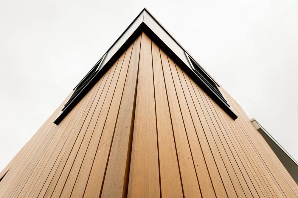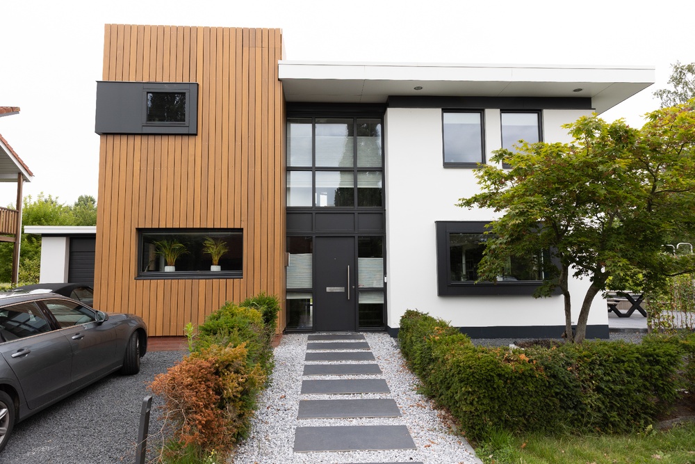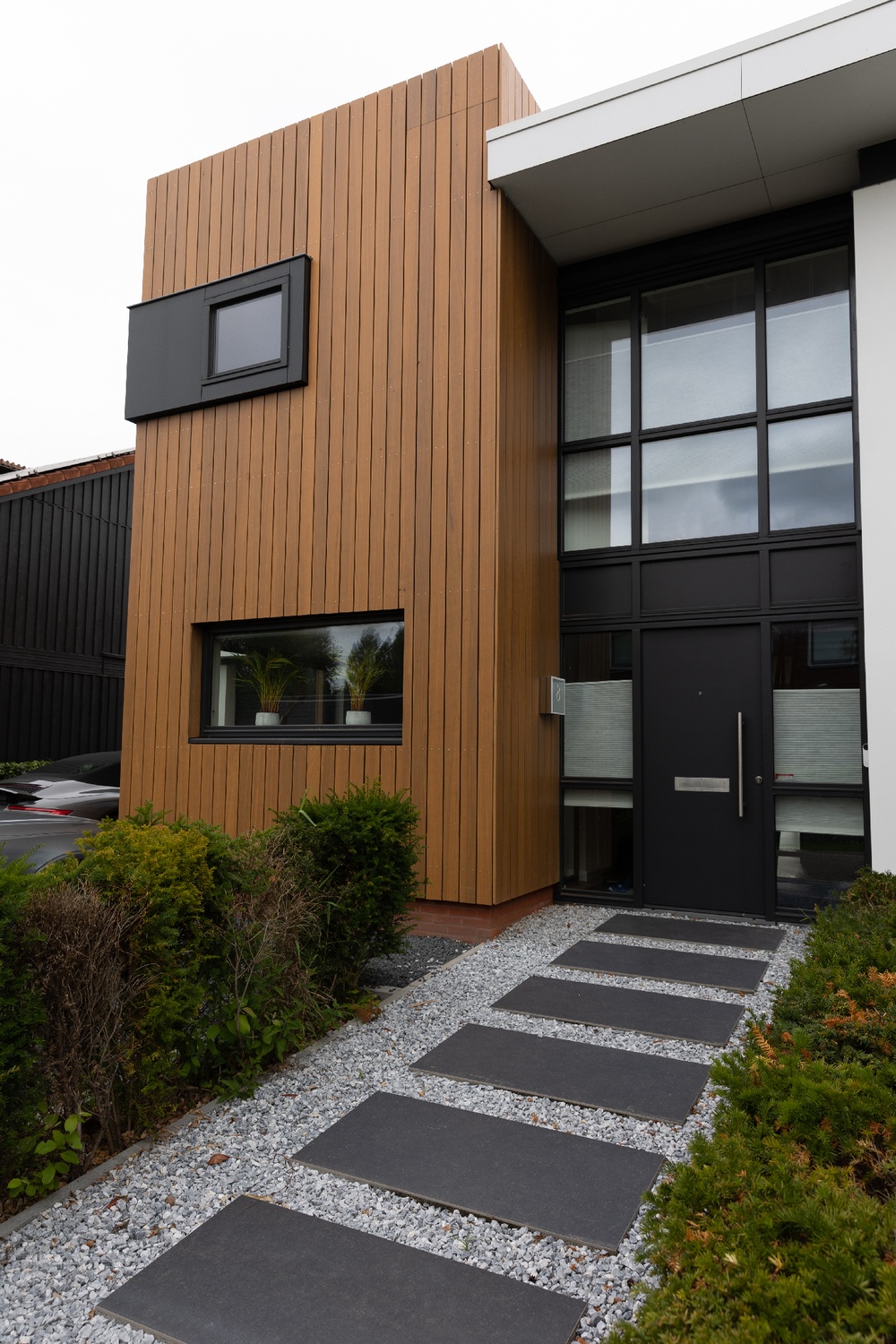 De combinatie van de houten gevel met de witte en zwarte elementen van de woning zorgt voor een krachtig contrast, zonder in te leveren op harmonie. De strakke verticale belijning benadrukt het moderne karakter van de woning en sluit mooi aan op het lijnenspel van de kozijnen.