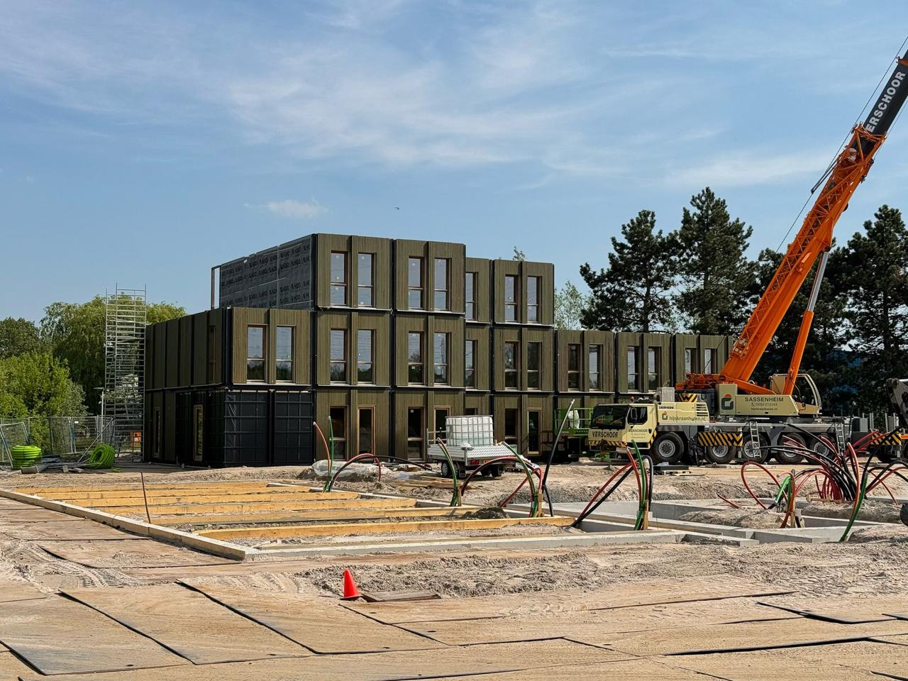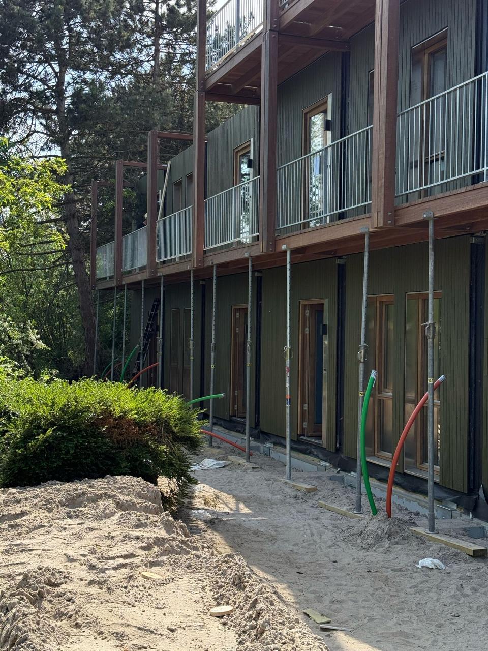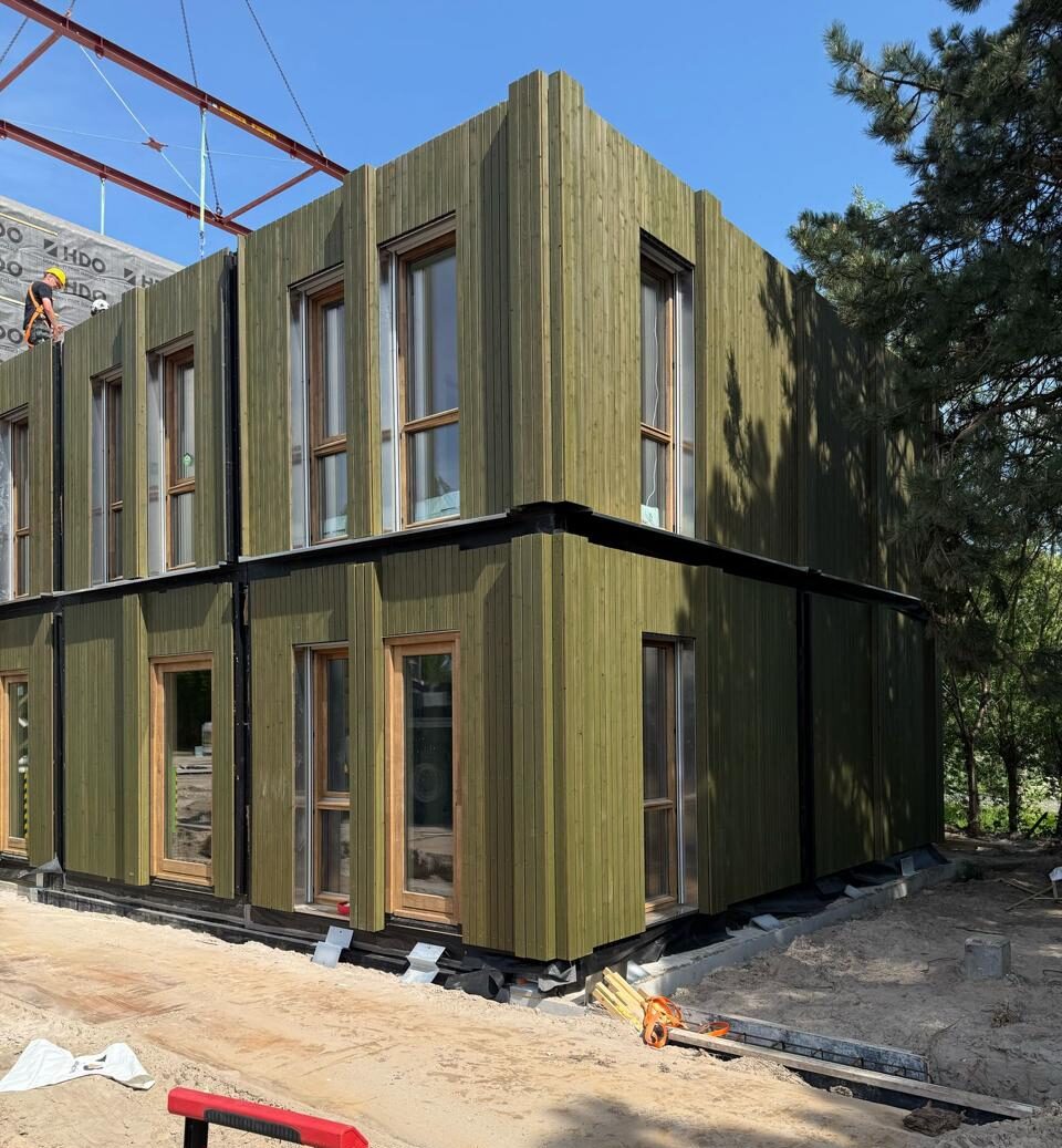 Voor dit project is gekozen voor een gevelbekleding in thermisch gemodificeerd Vuren, uitgevoerd in een S4S R3-profiel. De toegepaste delen in 20×67 mm en 20×90 mm zijn semi-groen gecoat, wat zorgt voor een eigentijdse en natuurlijke uitstraling. Dankzij de Thermische modificatie is het hout goed bestand tegen invloeden van buitenaf, terwijl het geheel onderhoudsarm en vormstabiel blijft.