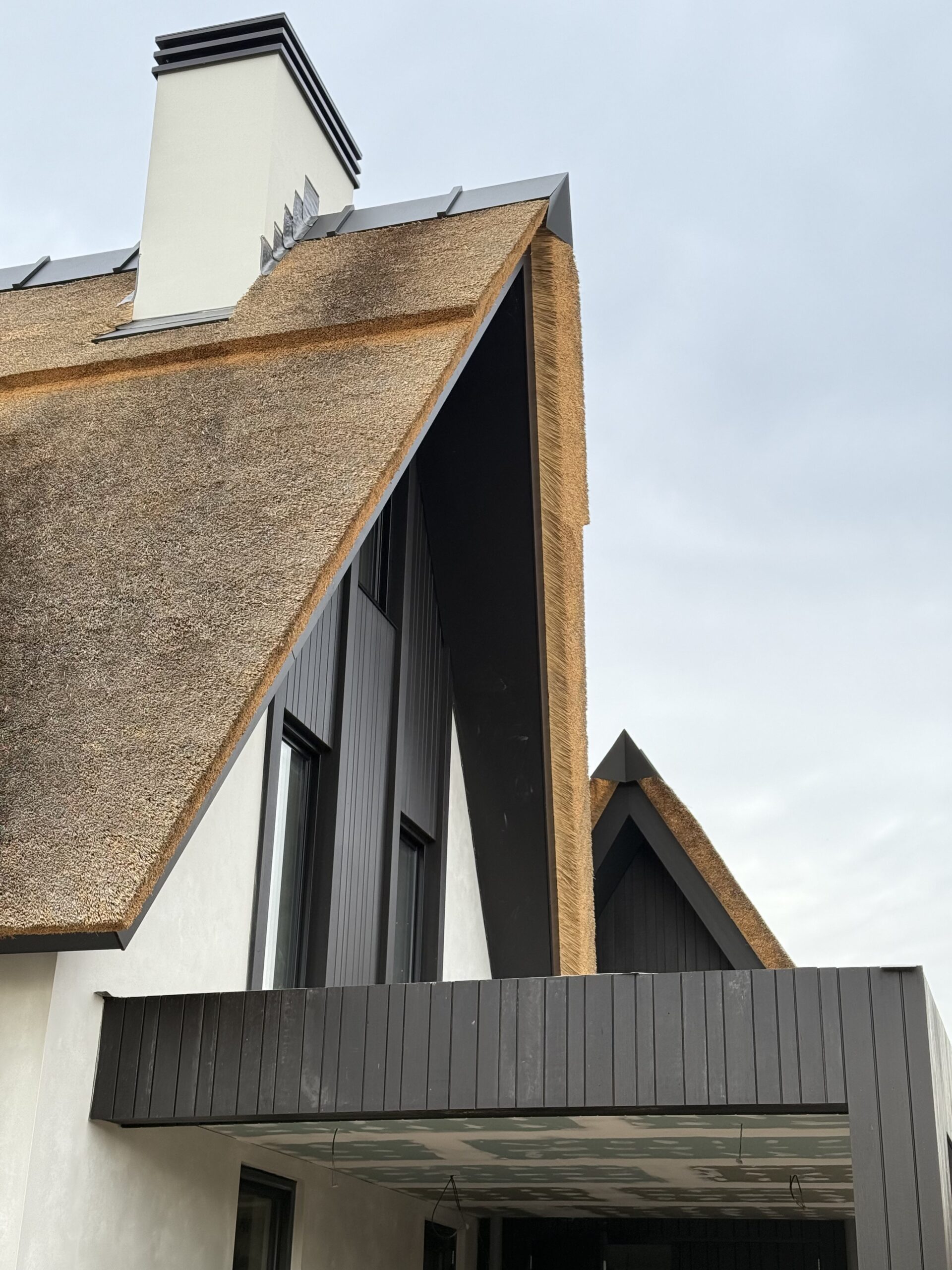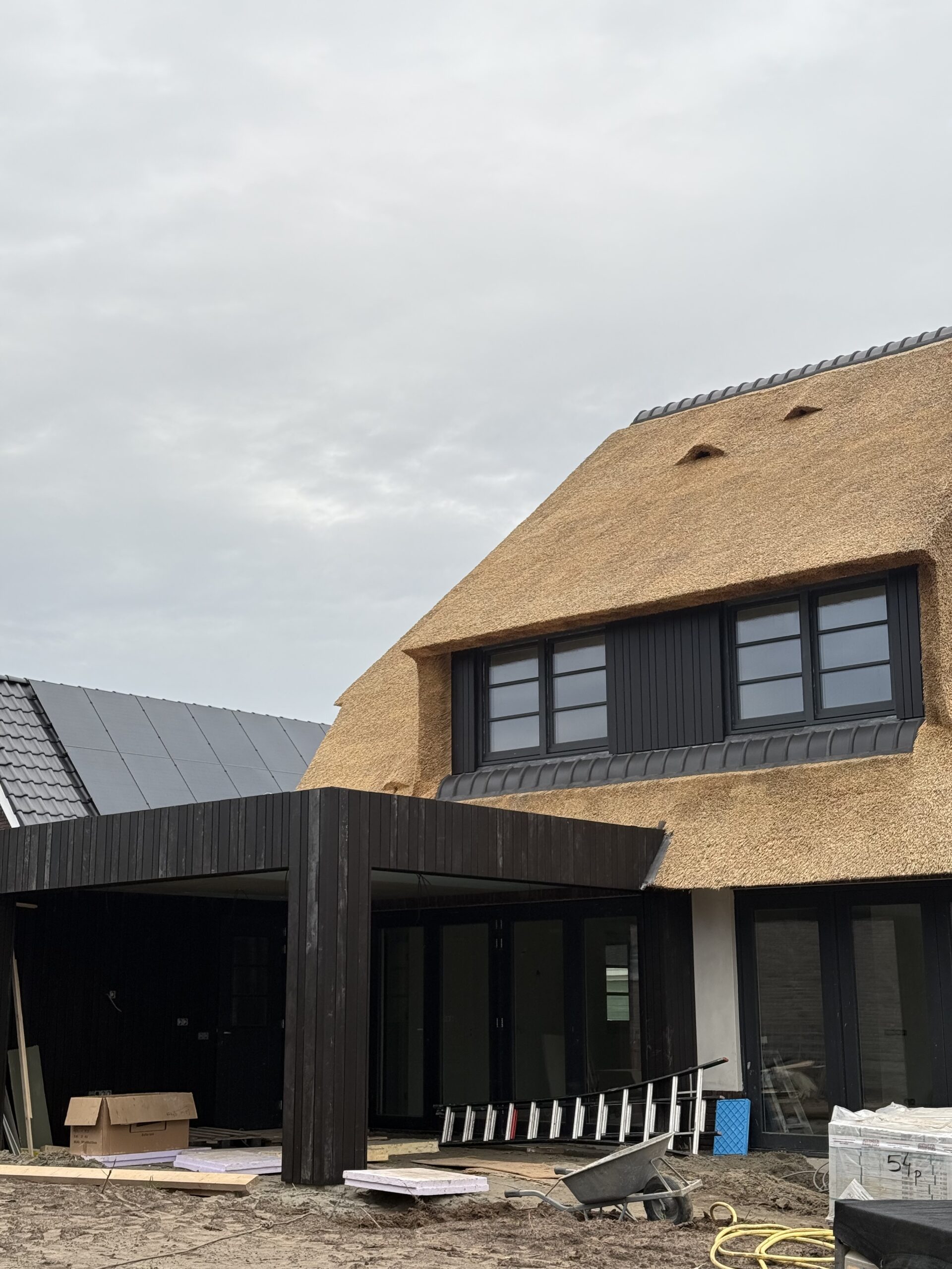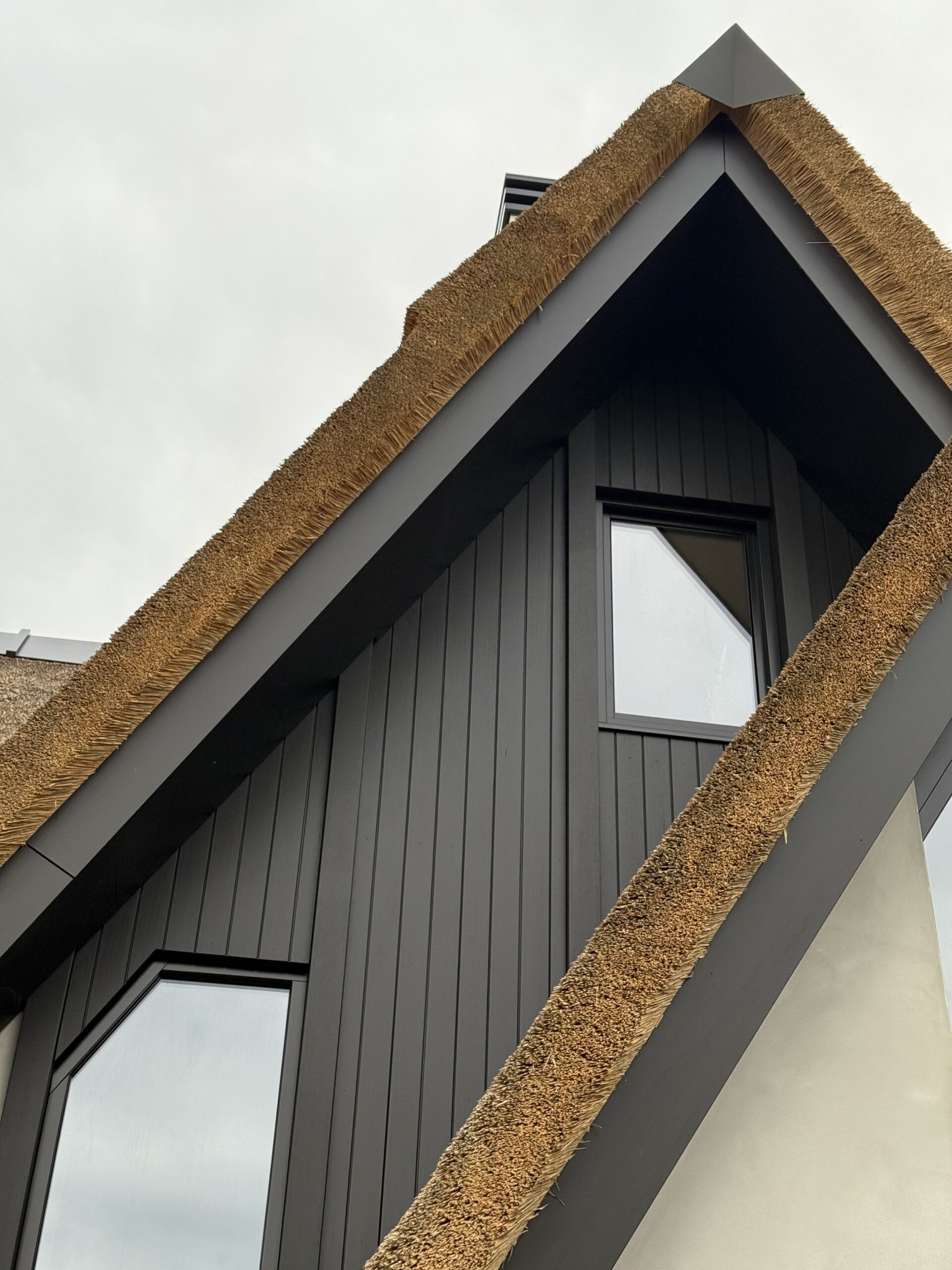 Voor deze twee moderne vrijstaande woningen is gekozen voor Thermo Fraké Channelsiding (in drie verschillende breedtes). De twee huizen worden eind 2025 opgeleverd. Maar deze prachtige gevelbeelden delen we alvast!